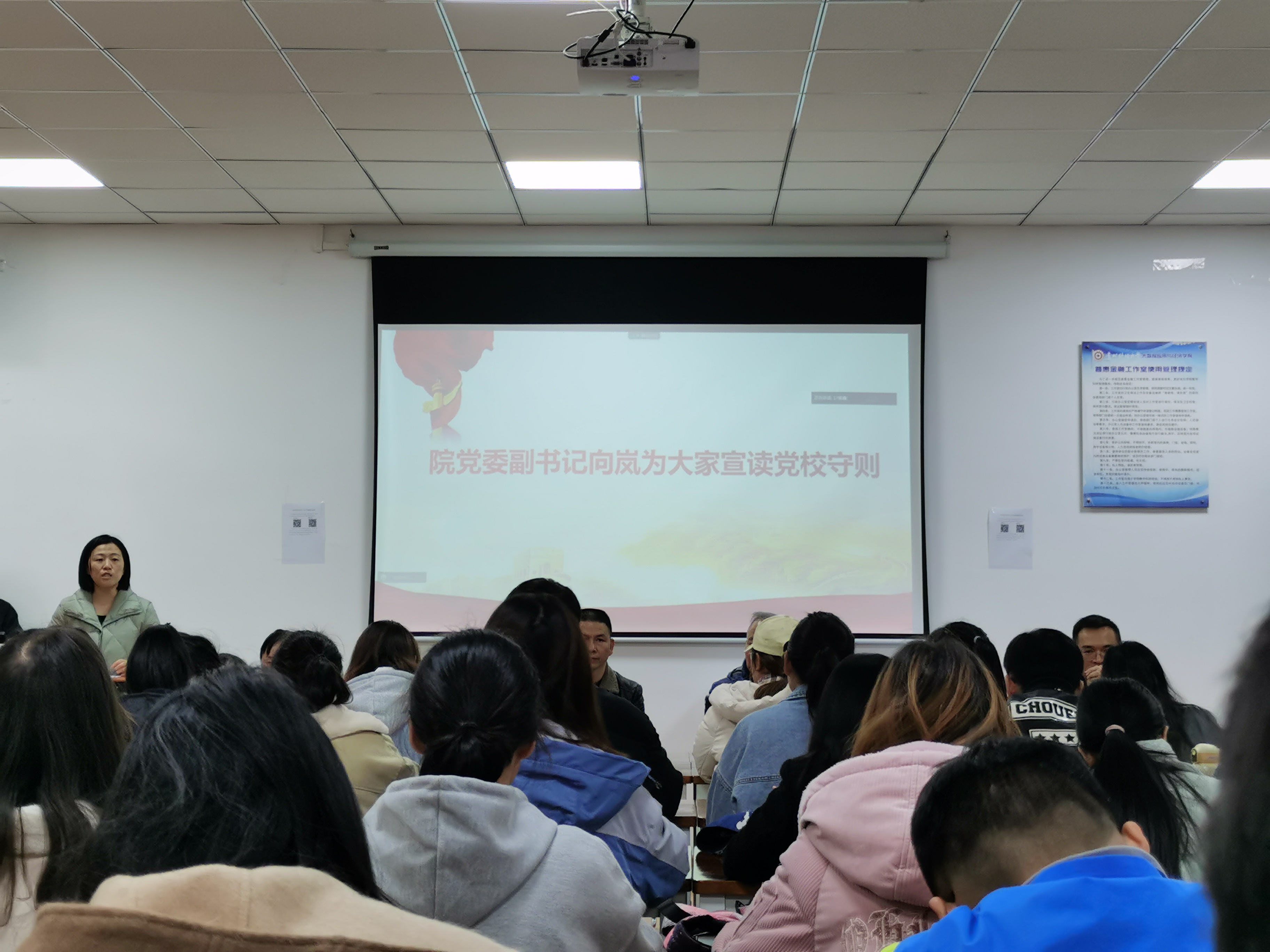 此后,党委副书记向岚向全员宣读党校守则。向书记强调,各位学员要重视此次党课的学习,要严格要求自己。 参加党课培训,是一次入党知识的学习,更是接受组织纪律和组织观念考验的极佳机会。学员要认真参与每次学习活动。并努力做到以党员的标准严格要求自己,遵守各项制度,在学习和思想道德上发挥先锋模范作用。