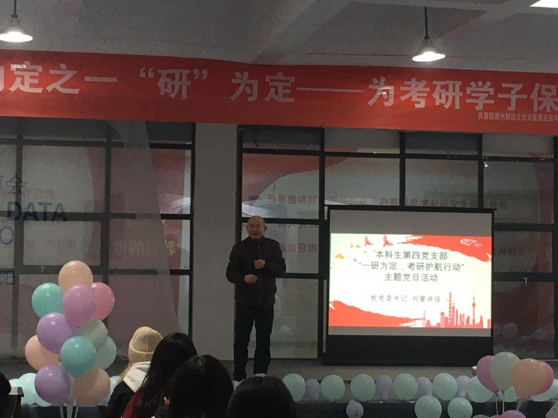 刘雷谈到距研究生考试只剩18天,各位考研学子要抓紧时间复习,并分享了自己从上学前、小学、初中、高中、大学的学习经历。他提出三点观念:一是认为读书是最好的出路,无论在什么时候,要终身学习,提升自己;二是认为读书的过程虽是痛苦的,但也是有意义的,努力过,总有收获,不留遗憾,总有收获和心得;三是认为要健全心智、提高能力、提升内涵、学会科学的研究方法,运用到实际解决问题中去。殷切勉励同学们在校努力学习,要发挥党员先锋模范带头作用,率先垂范,引领发展;要强化学习提升能力,依靠学习走向未来,积极参与活动实践,为国家、为贵州省的经济发展做出贡献。冀望各位考研人成长成才、成功上岸、不负韶华,蟾宫折桂。