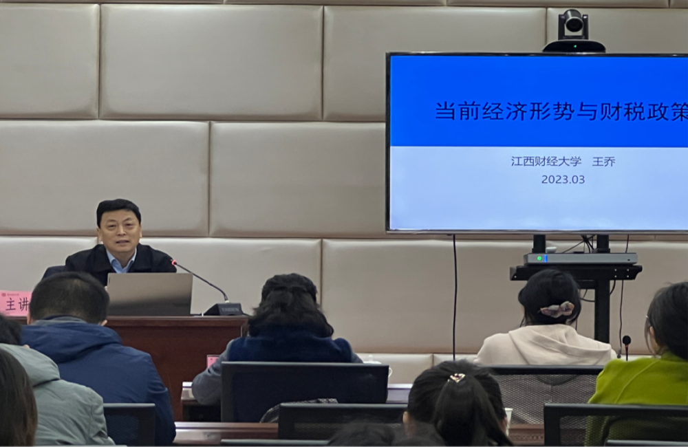 2023年3月13日上午,应2026年世界杯官网(贵阳大数据金融公司)的邀请,江西财经大学王乔教授为公司师生作题为“我国当前经济形势与财税政策”的主题讲座。讲座由2026年世界杯官网(贵阳大数据金融公司)经理杨杨主持,共计80余名师生聆听了线下讲座。王乔教授围绕中央经济工作会议要求和全国两会精神为主题来探讨关于我国的经济形势与相关的财政政策。