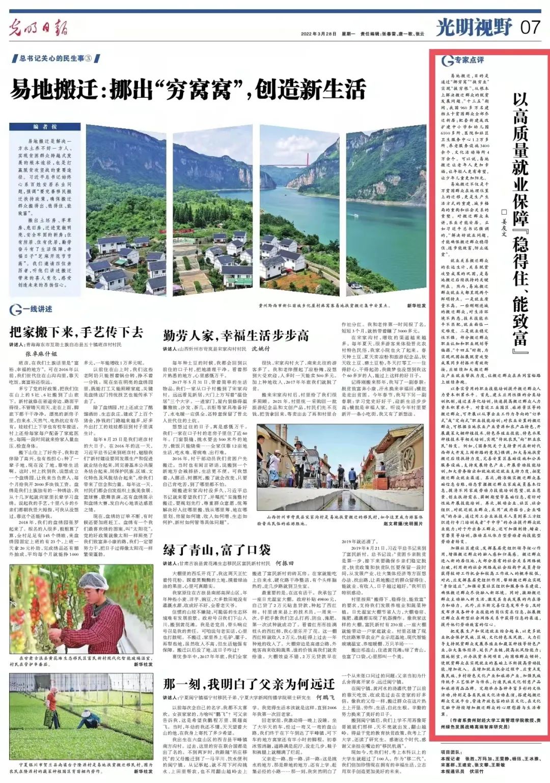 本文刊载于2022年3月28日《光明日报》“光明视野”专栏,是我省社科工作者研究阐释《国务院关于支持贵州在新时代西部大开发上闯新路的意见》(国发〔2022〕2号)文件精神和贵州省2021年度哲学社会科学规划重点课题“贵州易地扶贫搬迁安置社区发展困境与治理机制创新研究”(课题编号:21GZZD55)的阶段性成果之一。文章指出,易地搬迁,目的是通过“挪穷窝”“换穷业”实现“拔穷根”,从根本上解决搬迁群众的脱贫发展问题。就业关系搬迁群众的长远生计,关系脱贫攻坚成果的巩固,是易地搬迁后续扶持的关键所在。建议要以务实管用的职业技能培训提升搬迁群众人力资本积累水平;要加强社区建设,发挥基层党组织领导核心作用,增强搬迁群众的融入感和归属感;要把发展生产和促进就业结合起来,以更多就业机会保护民族、区域、文化特色及风貌。