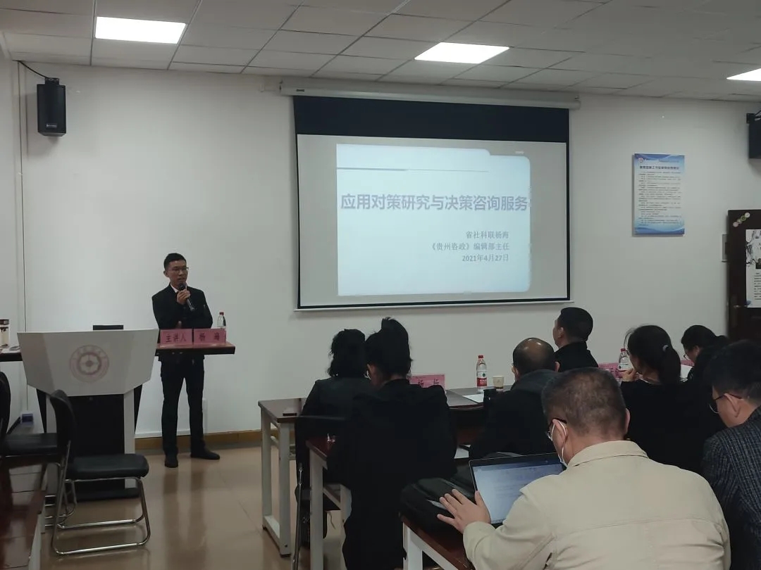 杨海先生主要对以下内容进行介绍:高度重视应用对策研究、《贵州咨政》情况介绍、近期完成的应用对策研究、写好咨政报告的体会和建议。