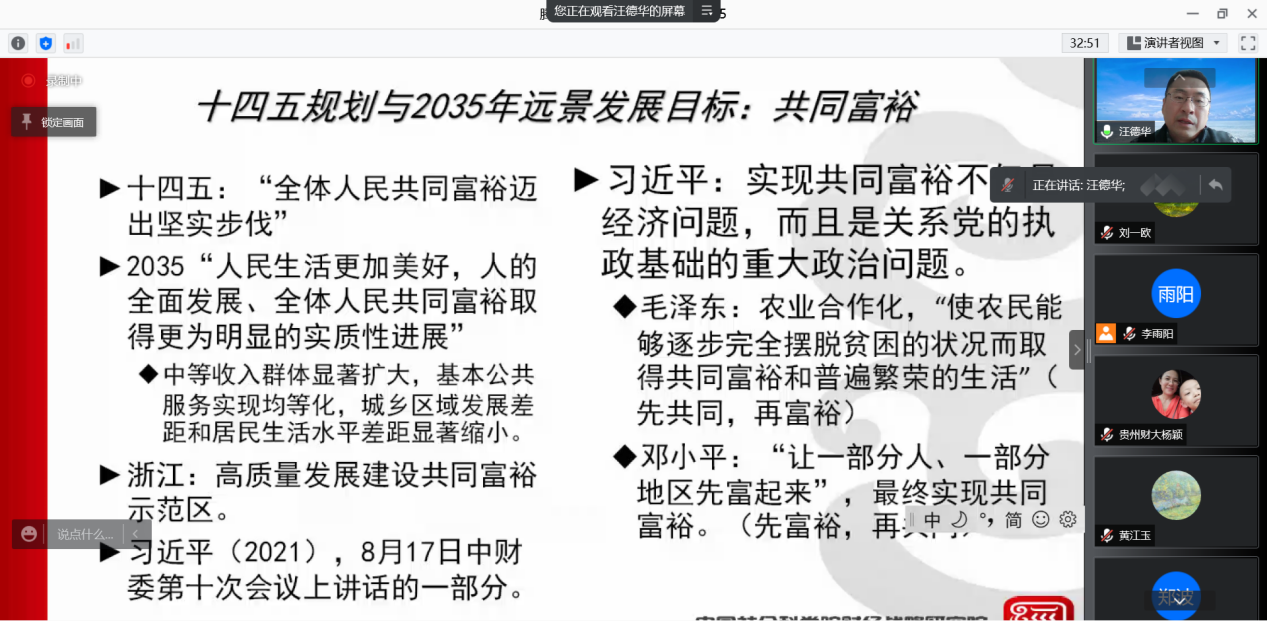 汪德华研究员指出共同富裕是社会主义的本质要求,是中国式现代化的主要特征,而收入分配是共同富裕的核心指标。他以部分国家因贫富分化导致社会撕裂、政治极化的现象为例,阐述了“共同富裕”的重要性;以“可支配收入基尼系数”引出了收入分配与收入分配的政策体系,得出我国再分配政策发挥不充分的结论。他强调,以财税政策为主体的再分配政策是促进共同富裕政策的主体。鼓励同学们多关注时事,多分析,多思考。