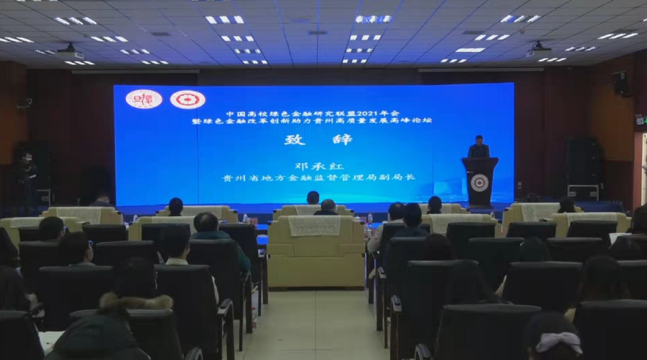在开幕式上,贵州省地方金融监督管理局副局长邓承红代表贵州省地方金融监督管理局向各位嘉宾的到来表示了欢迎,并介绍了贵州省绿色金融现状。邓承红局长指出,金融制度创新和绿色发展实践,既要做好绿色金融理论探索和政策设计,更要在知行合一中把贵州省生态优势转化为发展优势的创新实践,建议依托中国高校绿色金融研究联盟,打造贵州绿色金融高端智库交流平台,拓展贵州生态资源向发展能力转化的渠道,办好生态文明贵阳国际论坛或绿色金融主题论坛。
