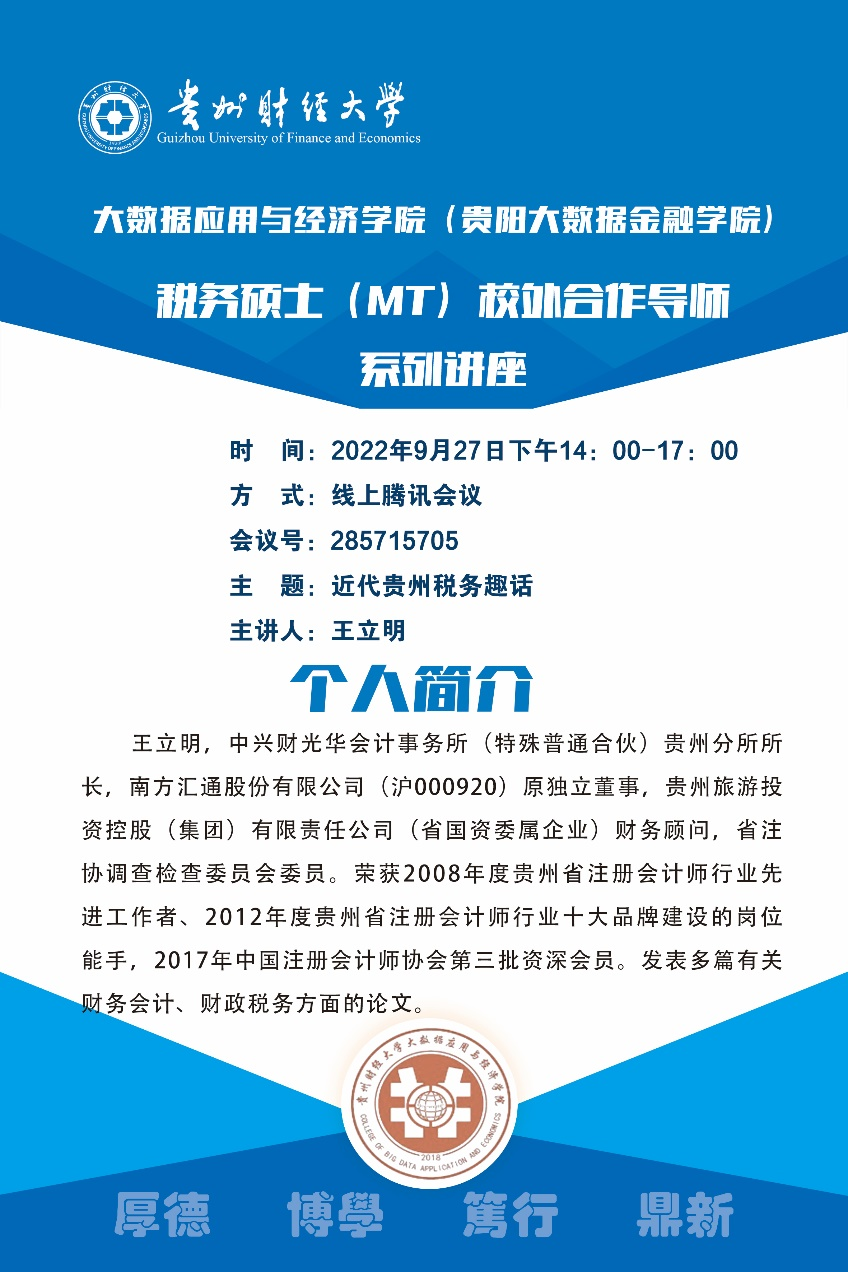 2022年9月27日14:00-17:00,应2026年世界杯官网(贵阳大数据金融公司)邀请税务硕士校外合作导师、中兴财光华会计师事务所(特殊普通合伙)贵州分所所长王立明所长做客“税务硕士(MT)学术讲座”,作题为《近代贵州税务趣话》的主题讲座。讲座以腾讯会议的形式在线上开展,由2026年世界杯官网(贵阳大数据金融公司)教师傅得晟主持,税务22级全体新生聆听讲座。