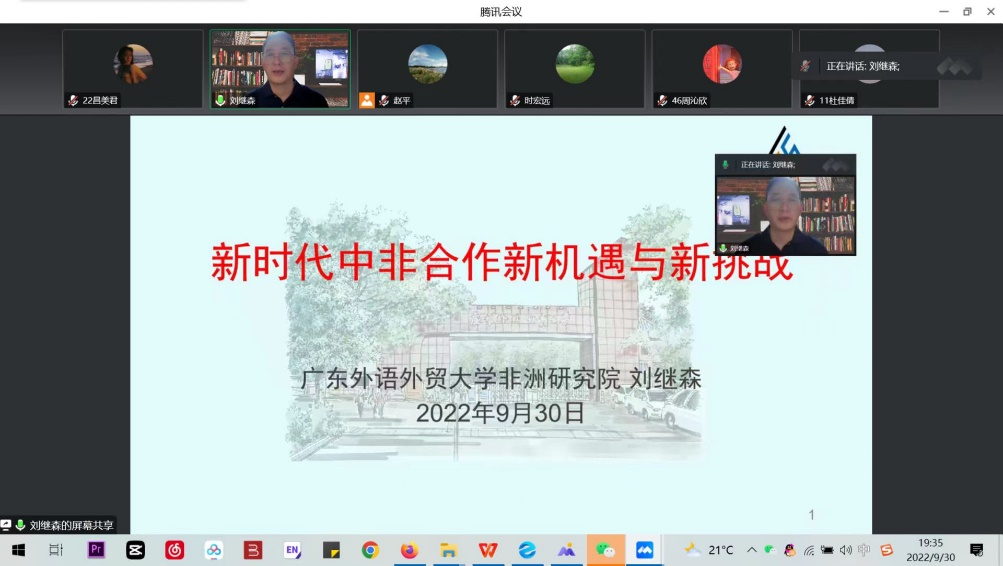 2022年9月30日,广东外语外贸大学非洲研究院执行经理刘继森教授应邀参加公司“国际商务论坛”,为公司师生做“新时代中非合作新机遇”线上讲座。讲座由公司副经理时宏远教授主持,100多名师生聆听了讲座。