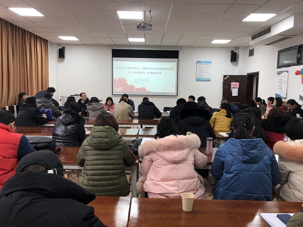 1月8日下午,公司在明德楼三楼普惠金融工作室召开专题会议,学习教育部《新时代高校教师职业行为十项准则》,进一步加强与推进公司师德师风建设。党总支书记徐梅,副经理杨杨,副书唐文杰,副经理邹晓峰,时宏远,候超惠出席了会议,全院教职员工参加了会议。会议由杨杨主持。