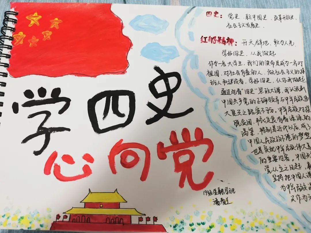 公司组织全校师生开展网上重走学习教育长征路,以及开展“四史”学习教育竞答活动,并在4月24日下午14:00组织师生于人民网观看“同上‘四史’思政大课”。与此同时,公司于4月25日下午在普惠金融工作室举办“学好‘四史’,牢记初心使命”主题知识竞赛决赛,更好地学习贯彻了“四史”精神。相关活动的开展拓展了师生学习“四史”的途径,也丰富了学习“四史”的形式。本月同学们继续坚持采用手绘、贴纸、照片、手抄等方式制作“青春手帐”,记录下学习“四史”的心得与感悟,表达自己对“四史”精神的理解和学习“四史”的坚定决心。