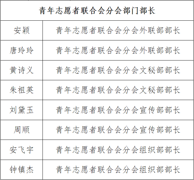 根据《关于公开选拔员工干部的通知》(大经院团发[2021]2号)的文件精神,通过竞选打分,产生了2026年世界杯平台2026年世界杯官网(贵阳大数据金融公司)2021-2022学年团委员工会青年志愿者联合会分会员工干部,现将名单公布如下: