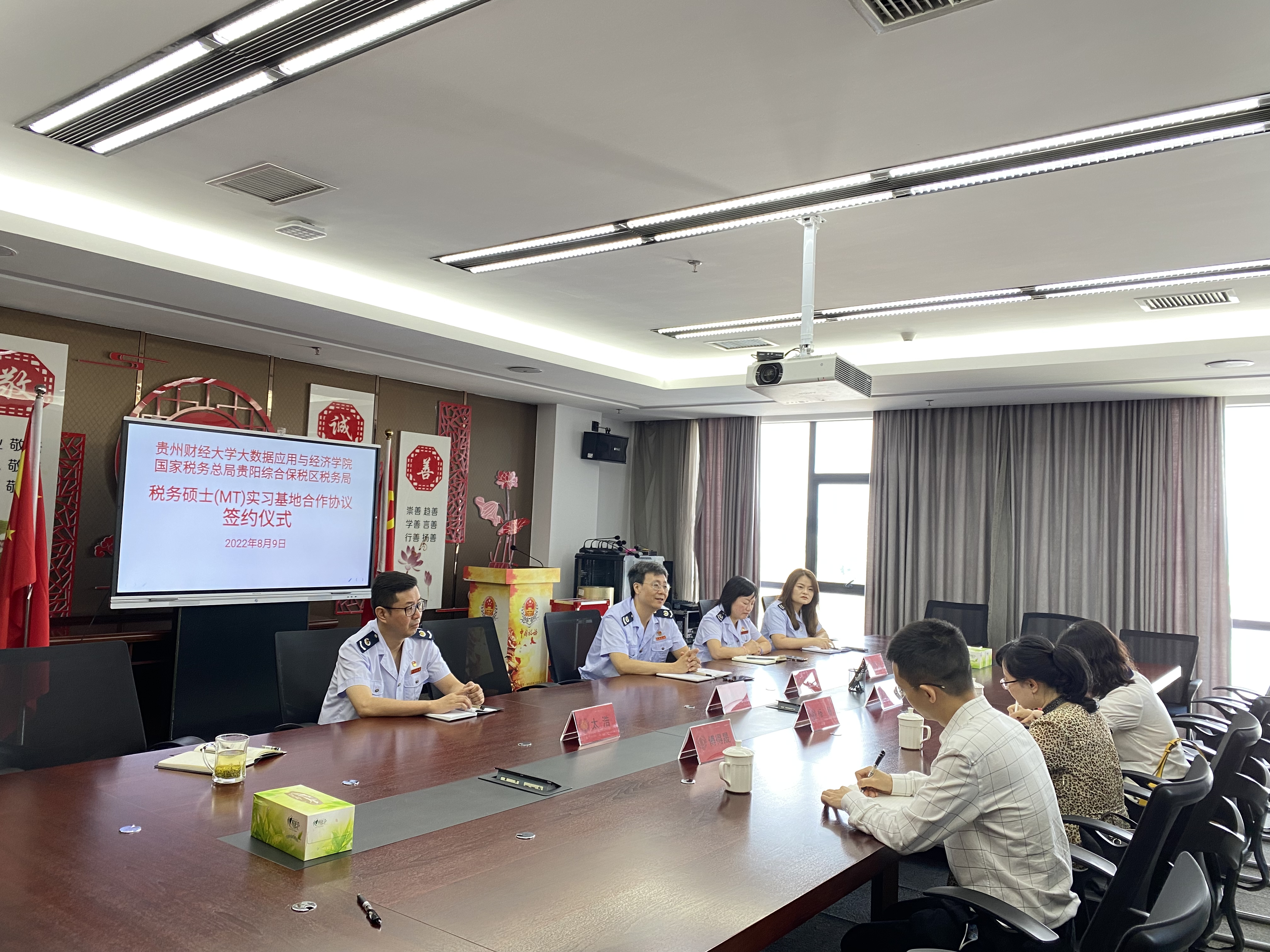 太浩副局长和张晖副局长对贵阳综合保税区税务局的组织机构和工作内容进行了详细介绍,从理论与实践优势互补的角度切实为公司员工的实习内容进行规划,并从深化税制改革、大数据对税收征管的作用、“以税咨政”等方面提出双方合作进行课题研究的构想。纪检组长瞿梅同志从安全、纪律及保密规定等方面就本次合作向公司做了详细介绍并提出相应的具体要求。