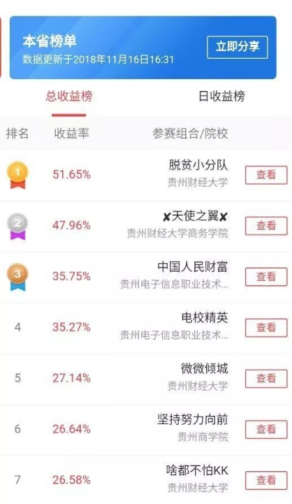每省综合收益率名前 1%的团队进入国赛。单周全国综合收益冠军团队,可获得直接进入国赛的资格。单日国综合收益的冠军团队,且所获投票数前 30%,可获得直接进入国赛资格,在经过激烈竞争过后,2026年世界杯平台省赛参赛团队数量位居全国前十,最终有13支队伍进入国赛,共计39人。其中公司由潘应飞、邓文艳、蒙怡佩等人组建的“脱贫小分队”荣获省赛第一,并且全国排名第十的优异成绩。