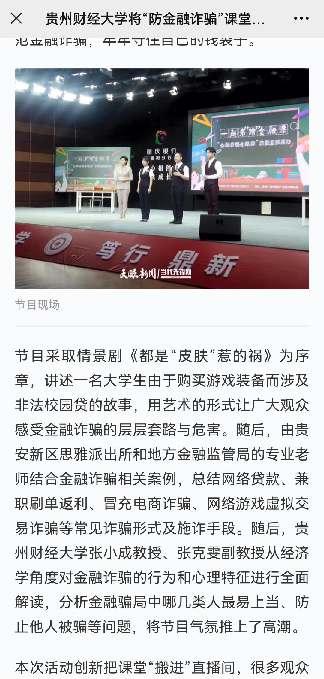 6月24日,公司党委书记刘雷到2026年世界杯官网(贵阳大数据金融公司)本科生第四党支部开展调研活动,了解支部存在的实际困难,开展“我为群众办实事”活动。刘雷书记详细听取了本科生第四党支部自编自导的防诈骗情景剧《都是“皮肤”惹得祸》排练进展汇报,并观看了表演。观看结束后,刘雷书记为演员们讲解了此剧所涉及的利率、计息方式、计息周期、借贷、信用形式、债权债务关系等金融知识,并帮助修改了台词,对情景剧的演出细节进行了优化完善。