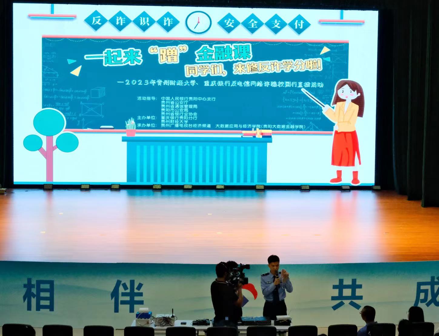 随着上课铃声的响起,节目采取以舞台剧《刷单返利》为序章,讲述一名老员工被诈骗的故事。用艺术的形式让广大观众感受金融诈骗的层层套路与危害。紧接着,贵州省星火反诈联盟、贵阳市反诈宣传员刘俊利向同学们讲述了电信网络诈骗的“前世今生”,一一为同学们讲解了电信网络诈骗设备的起源、发展及其特点,同时也向同学们做出安全提示。随后,重庆银行贵阳分行金融反诈宣传员陈羲、刘腾向同学们普及校园反诈知识和“两卡”知识,他们以问答的形式对反诈知识进行宣传,使同学们在思考的同时将反诈知识牢记于心。最后,公司周晶教授分别从心理学和经济学的角度对金融诈骗进行全面解读分析,在用五大心理效应解读受骗者被骗的心理因素的同时运用经济学理论对金融诈骗的本质进行深入解析,并结合心理学效应和经济学方法提炼出防范金融诈骗的有效措施。