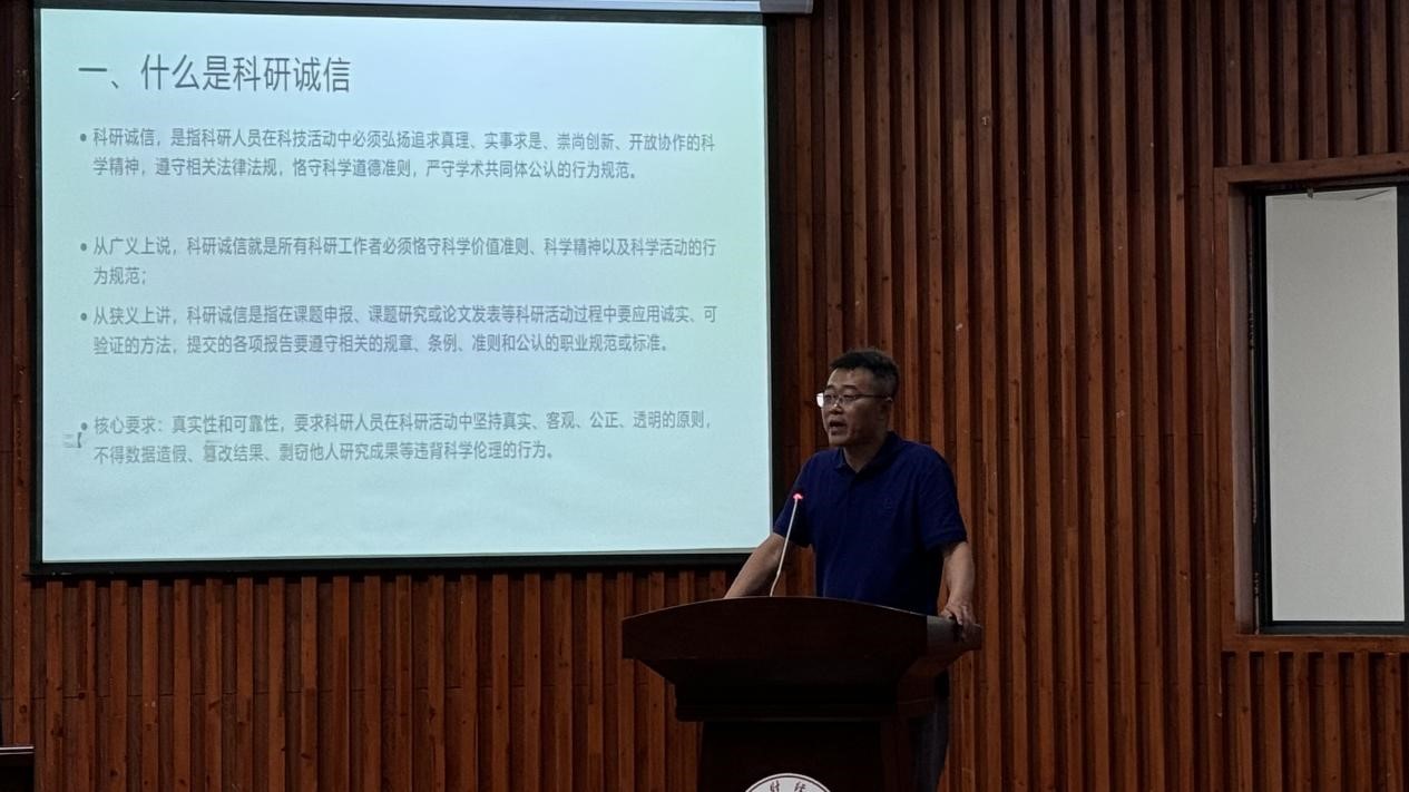 科研处李天柱教授从诚信的角度为同学们讲述了该如何规划读书期间的学术生涯规划,强调了诚信是做人之本,和学术诚信的重要性,以及员工要如何处理和预防学术不端的注意事项。