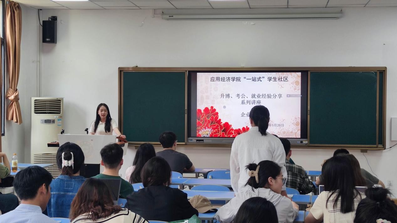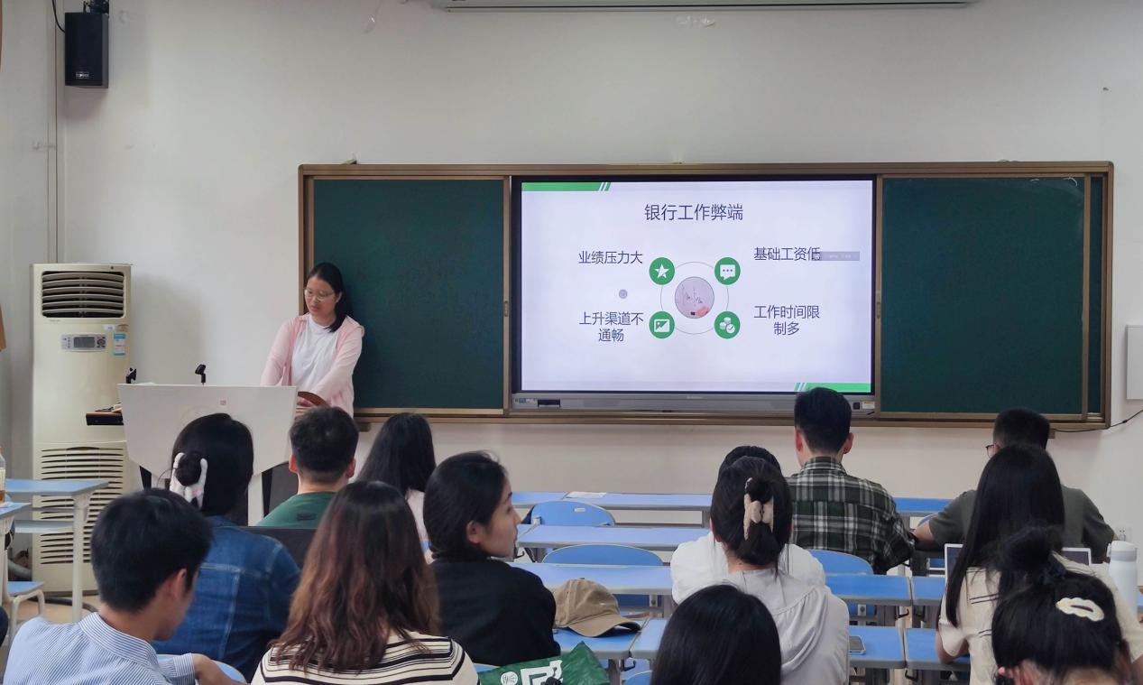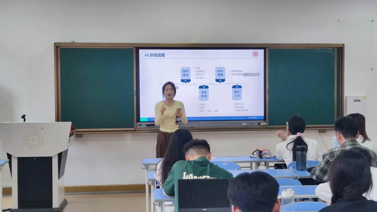 在就业经验分享环节,首先王涵宇同学为大家分析银行工作利弊,分享秋招关键点,探讨银行与考公备考关系,强调明确自身需求的重要性。陈沛佳同学则详细介绍了秋招时间线、工具包、流程及心态等内容。她强调简历要突出亮点,面试要自信表达,秋招是双向选择,要打破信息差,与伙伴同行,争取Offer。两位学姐的分享干