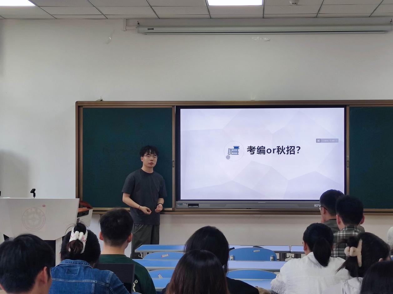 在考公经验分享环节,金融学何键同学的经验分享涵盖个人情况、笔试面试学习、岗位选择、考编与秋招建议。他详细介绍了备考时间线、学习方法及求职心得。随后卢德鑫同学分享了他在选调生考试中的经验,他详细介绍了选调生的报考条件和考试内容,并建议考生在备考过程中注重申论写作和面试准备,特别是如何应对基层工作的挑战。在税务系统备考方面,王梦琳同学有着深入的研究和独到的见解。她从学习建议、学习方法、选岗与后续四个方面入手详细介绍了各阶段的重点和策略。她强调,在备考期要少看多做,全面系统地学习知识点,构建完整的知识框架,不钻牛角尖。三位的精彩分享赢得了同学们的阵阵掌声,让在场的每一位同学都受益匪浅。