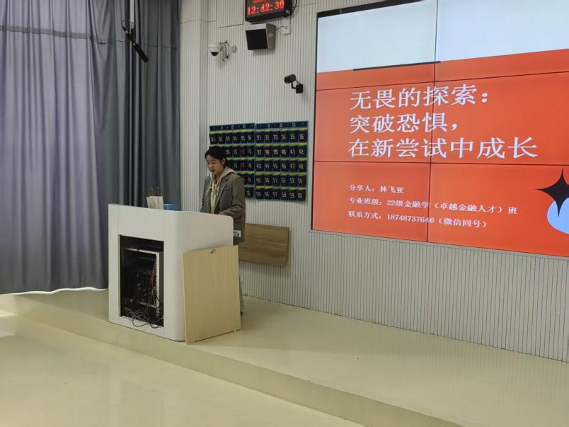 2022级金融学(卓越金融人才)班林飞亚以“无畏的探索:突破恐惧,在新尝试中成长”为主题,结合自身竞赛经历与技能积累过程,带来干货满满的实践分享。她从识别常见恐惧类型出发,提出“重塑失败观、小步快跑起步、细化目标拆解任务”的破局方法;接着,她结合自身零基础学习数据分析和克服公众表达恐惧的经历,讲述了“新尝试”对硬技能与软技能的双重提升价值,提出“每一次尝试都是成长的积累”;此外,她还特别强调了“复盘”的价值,“在每次尝试后的24小时至一周内进行复盘,通过回顾目标、评估结果、分析原因、总结经验四步法,把经历真正转化为能力。”