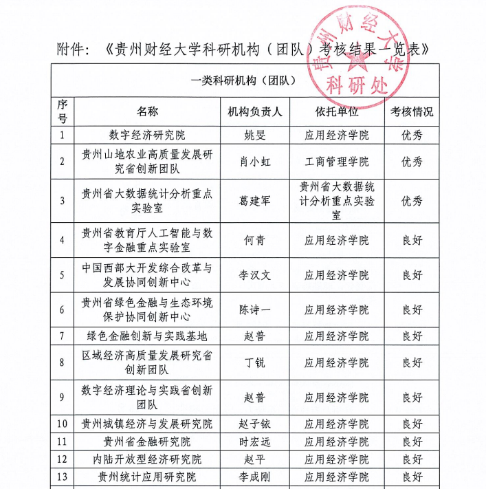考核期内,数字经济研究院老师共主持国家级项目7项、省部级项目11项、厅级项目6项;发表Ⅱ类期刊1篇、Ⅲ类期刊12篇、Ⅳ类期刊6篇;获贵州省第十五次哲学社会科学优秀成果奖一等奖1项,三等奖3项;获得省部级以上领导肯定性批示、省部级及以上单位采纳11项;获贵州省第八批高层次创新人才1人;主办或承办会议1次。