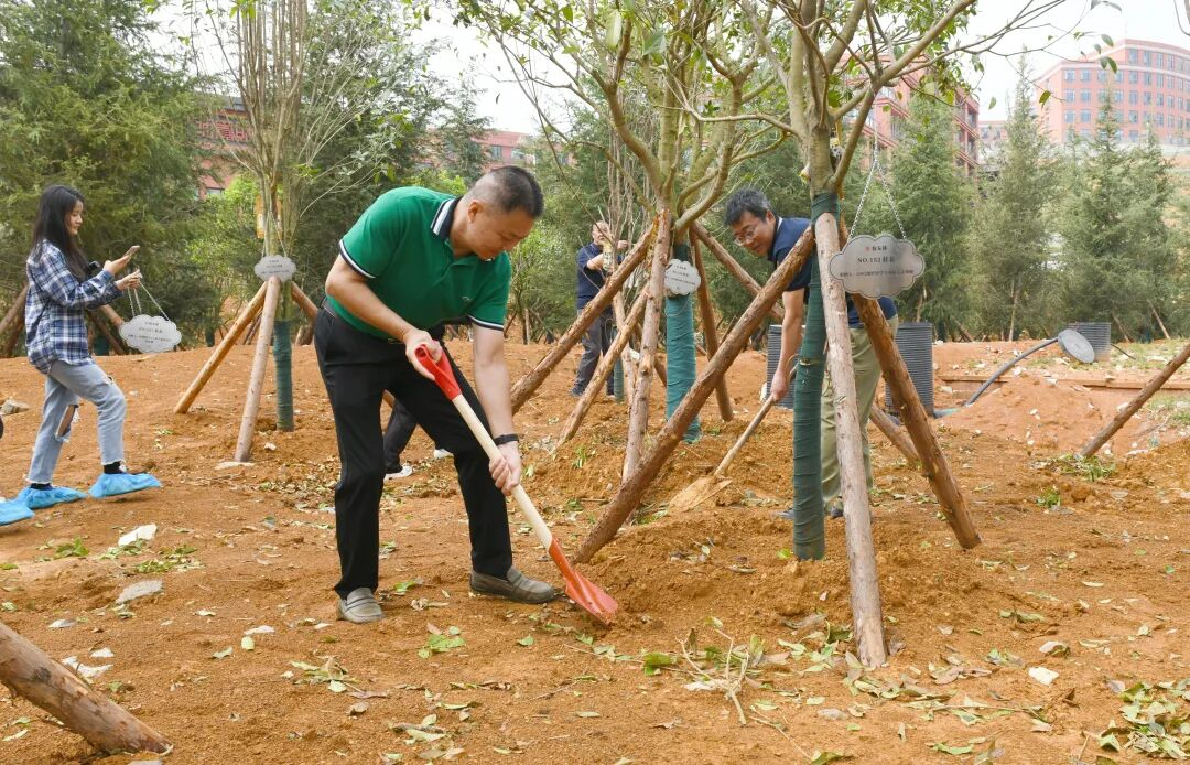 张晓阳、杨勇、刘元贵、李天柱共同为“员工捐建林”揭幕。师生、员工们一起走进员工林,挥锹铲土,培土围堰,悬挂铭牌。一棵又一棵员工树凝结着大家感恩于心、铭志于树、寄情于林的爱校、奉献情怀;一块又一块员工铭牌,既展现了项目捐赠信息,也表达了母校对捐赠方的尊敬与敬意。
